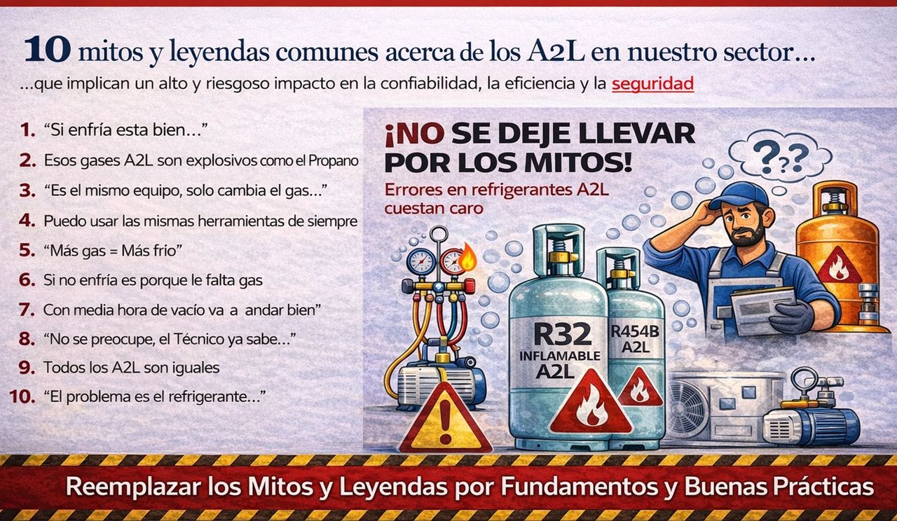 En el proceso de transición hacia los refrigerantes A2L, se ha identificado que uno de los principales desafíos no radica en la tecnología ni en la normativa vigente, sino en la persistencia de mitos y conceptos erróneos ampliamente difundidos. La recopilación de los “10 mitos y leyendas comunes acerca de los A2L” refleja una problemática recurrente en América Latina, donde ciertas decisiones técnicas se fundamentan frecuentemente en supuestos heredados, experiencias aisladas o afirmaciones no verificadas, lo que actualmente compromete la seguridad, la confiabilidad y la eficiencia de los sistemas de climatización que aplican estos fluidos refrigerantes.